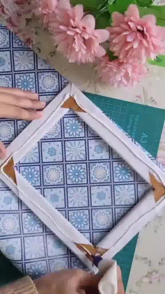 Flip the frame over and cut a piece of decorative paper to the size of the cardboard base. Glue this paper to the back of the frame to add a pop of color and style.