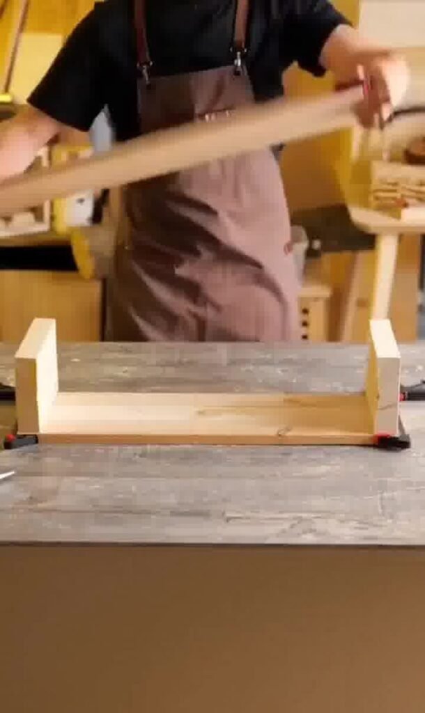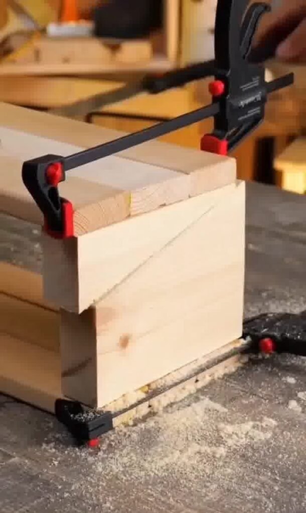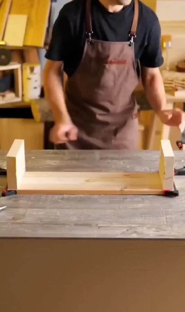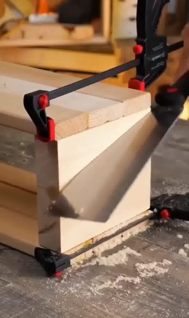 Once the glue is dry, use a saw to cut a diagonal line on the outer ends of the two side supports.
